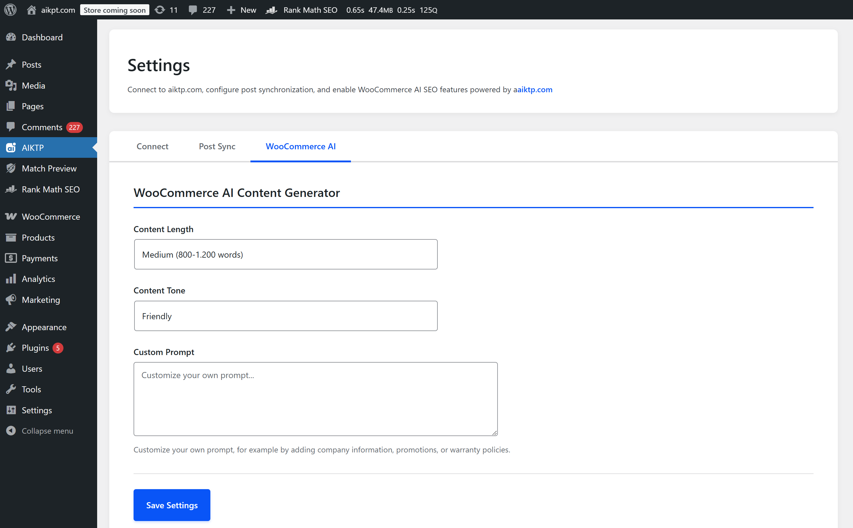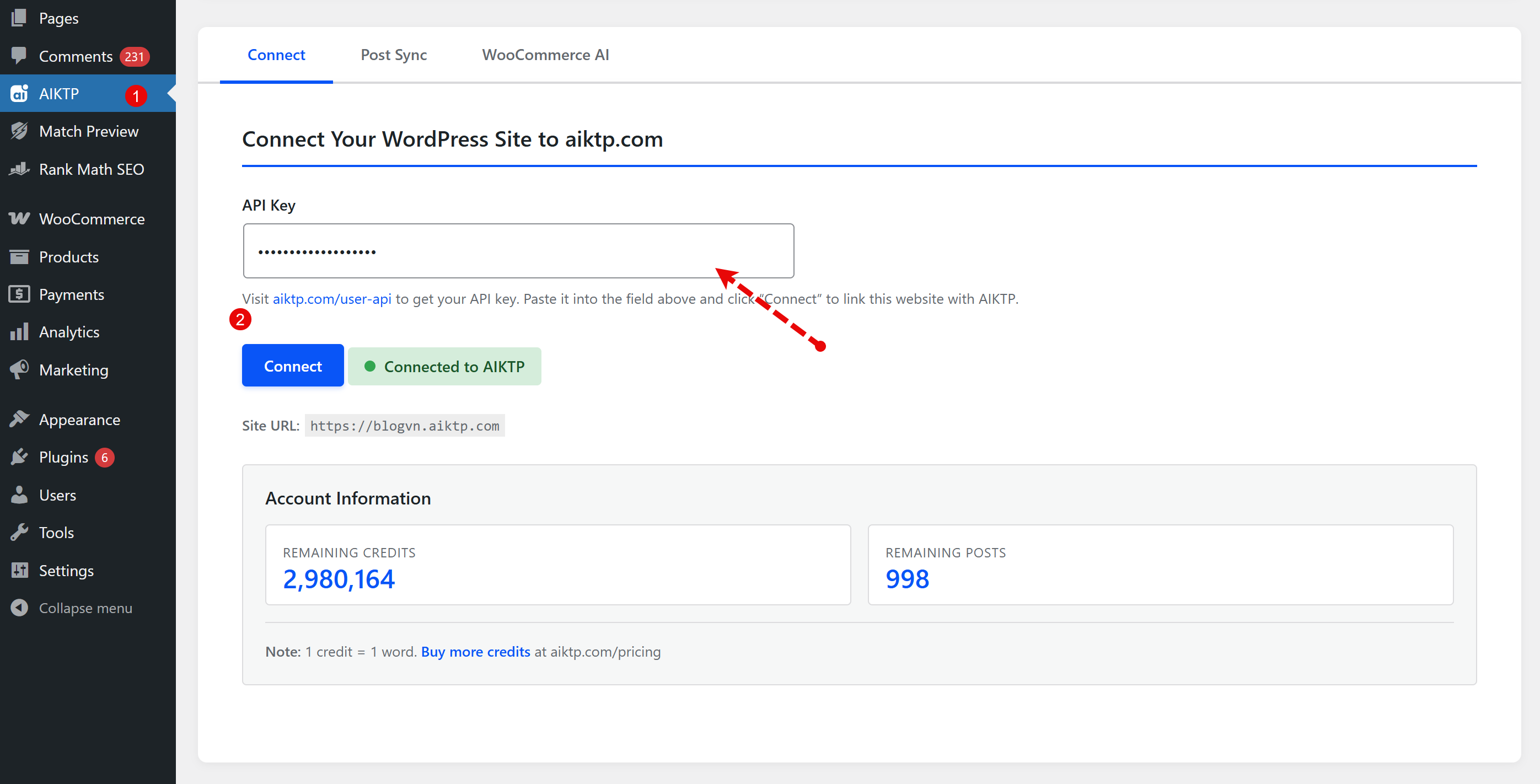 Sau khi tải và kích hoạt plugin, bạn kết nối plugin với tài khoản aiktp của bạn