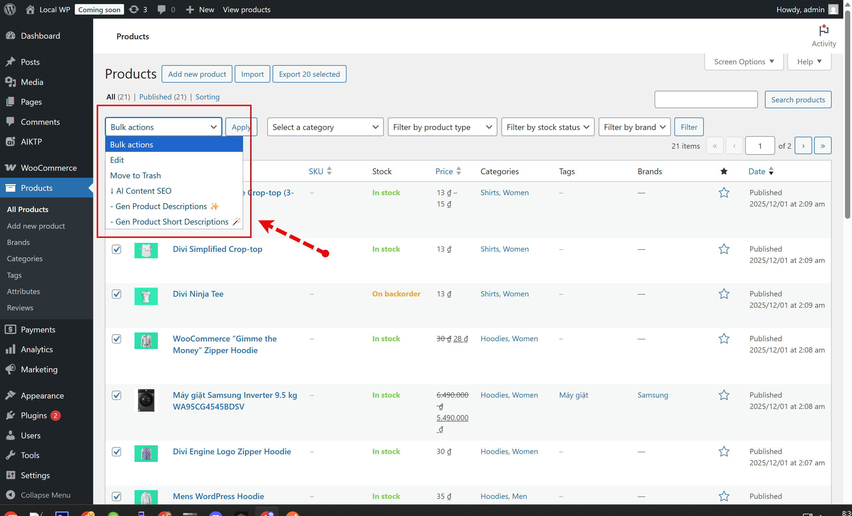 Sau đó bấm **Bulk Actions** và chọn **Generate Product Descriptions**. AIKTP sẽ tự động tạo mô tả cho toàn bộ các sản phẩm đã chọn.