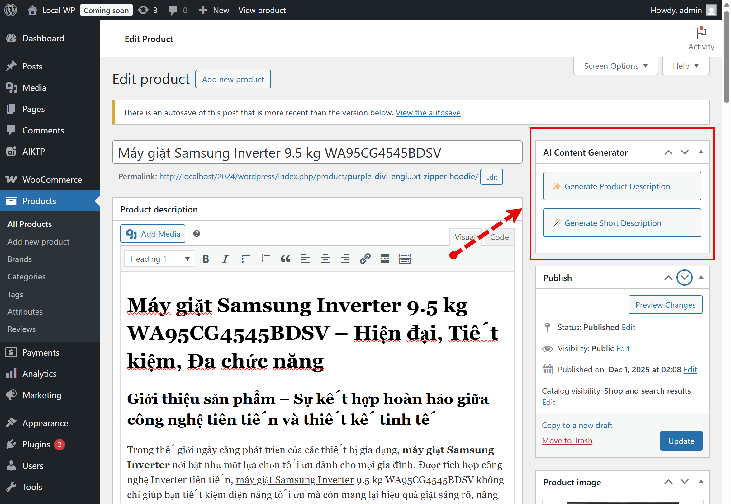 AI Woo tính năng viết giới thiệu sản phẩm cho WooCommerce bằng AI.